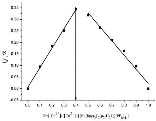 Job’s plot in CH3CN/H2O (v/v, 1:1) of the complex [{Ru(bpy)2}2(μ2-H2L)](PF6)4 and Cu2+ binding.