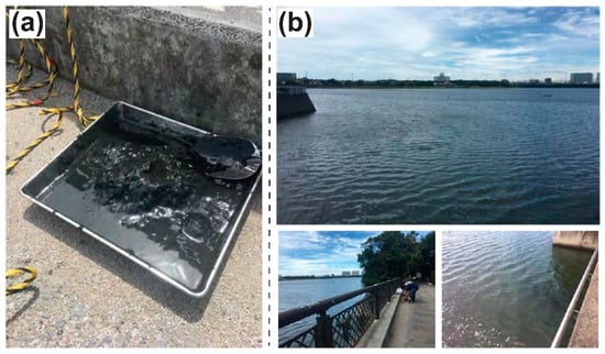 Pictures of the sampling point (Yatsu Tideland, Japan). (a) Picture of the sample. (b) State of the sampling place. The sample was taken from a bridge, as shown in the picture, using an Ekman–Birge grab.