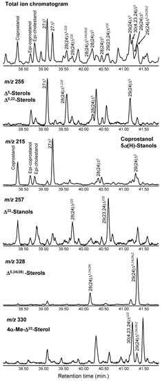 Determining each sterol from the GC–MS results can be effectively achieved from the extracted ion chromatograms of each sterol. The ion at m/z 255 is useful to determine Δ5-, Δ5,22-, and Δ5,24(28)-sterols. Ion chromatograms with m/z 215, 257, 328, and 330 represent 5α- and 5β-stanols, Δ22-stanols, Δ5,24(28)-sterols, and 4α-Me-Δ22-sterols, respectively (Figure 4).