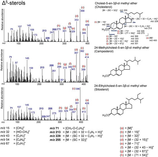 [M]+, [M − 15]+, [M − 32]+, [M − (32 + 15)]+, [M − 71]+, [M − (32 + 67)]+, [M − (71 + 54)]+, and [M − (71 + 82)]+ are all ions that were not accompanied by the loss of the SC (Figure 5). These ions were also confirmed from the fragmentation of sterol TMS derivatives, although their intensities in methyl ethers are relatively high than in TMS ethers. [M − 15]+ is produced by the loss of a methyl group from sterols. [M − 32]+ represents the loss of HO–CH3. The additional loss of a methyl group and C5H7 from [M − 32]+ yields [M − (32 + 15)]+ and [M − (32 + 67)]+, respectively. [M – 71]+ arises from the loss of CH3–O–C3H4. Additionally, [M − (71 + 54)]+ and [M − (71 + 82)]+ are generated by an additional loss of C4H6 on the A-ring or C6H10 on the A- and B-rings, respectively. [M − (32 + 43 − H)]+ can result from the loss of HO–CH3 from Δ5-sterols, followed by the loss of C3H7 (without a hydrogen atom) at the end of the SC (Figure 5).