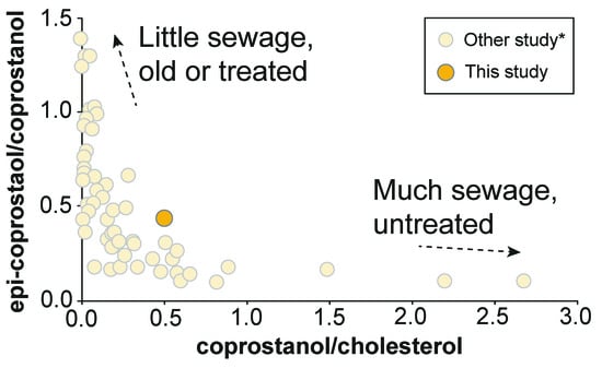 - Pierce, R.H.; Brown, R.C. Coprostanol distribution from sewage discharge into Sarasota Bay, Florida. Bull. Environ. Contam. Toxicol. 1984, 32, 75–79. [Google Scholar] [CrossRef] [PubMed]