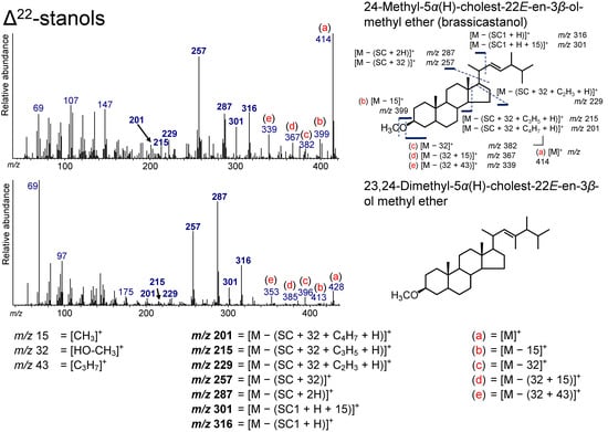 The peaks at m/z 316, 301, 287, 257, 229, 215, and 201 are due to ions that accompany the cleavage of the SC (Figure 9). The peak at m/z 316 results from the loss of the side chain (SC1) with a hydrogen atom from Δ22-stanols ([M – (SC1 + H)]+), and the additional loss of a methyl group yields the ion at m/z 301 ([M – (SC1 + H + 15]+). The peak at m/z 287 originates from the loss of the side chain (with two hydrogen atoms) from Δ22-stanols ([M – (SC + 2H)]+). An intense peak at m/z 257 is derived from the loss of HO–CH3 and the side chain from Δ22-stanols ([M – (32 + SC)]+). This ion, m/z 257, is a characteristic ion that is used for the determination of Δ22-sterols, as in the case of TMS derivatization [51,63,64], and it shows that the sterol skeleton is saturated (no double bond on the C5–C6 position) as with 5α(H)-stanols [51]. The peaks at m/z 229, 215, and 201 can arise from the loss of C2H3 (with a hydrogen atom) at the D-ring ([M – (32 + SC + C2H3 + H)]+), the loss of C3H5 (with a hydrogen atom) at the D-ring ([M – (32 + SC + C3H5 + H)]+), and C4H7 (with a hydrogen atom) at the D- and C-rings from the ion at m/z 257 ([M – (32 + SC + C4H7 + H)]+). Ions [M]+, [M − 15]+, [M − 32]+, [M − (32 + 15)]+, and [M − (32 + 43)]+ were confirmed to be not accompanied by the loss of the SC (Figure 9). [M − (32 + 43)]+ can arise from the loss of HO–CH3 from Δ22-stanols, which is followed by the loss of C3H7 on the end of the SC.