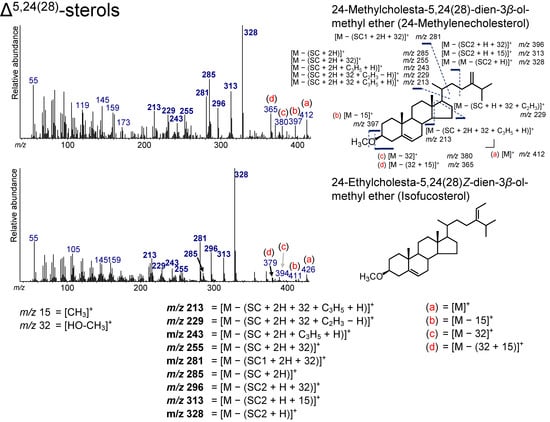 The spectra of both Δ5,24(28)-sterols show peaks at m/z 328, 313, 296, 285, 281, 255, 243, 229, and 213 (Figure 10). Of these ions, the peaks at m/z 328, 313, 285, and 243 were also confirmed in the spectra of the Δ24(28)-sterols. The ion at m/z 328 arises from the loss of the side chain (SC2) with a hydrogen atom and is also a characteristic ion for Δ5,24(28)-sterols. The peaks at m/z 255, 253, 229, and 213 are also visible in the fragmentation pattern of other sterols, such as Δ24(28)-sterols and Δ5-sterols. The peak at m/z 296 results from the losses of the side chain (SC1) and HO–CH3 from Δ5,24(28)-sterols ([M − (SC1 + 32)]+). The additional elimination of a methyl group yields m/z 281 ([M − (SC1 + 32 + 15)]+). Ions [M]+, [M − 15]+, [M − 32]+, and [M − (32 + 15)]+ were confirmed to be ions that are not accompanied by the loss of the SC, which are also present for other sterols, including Δ5-sterols (Figure 10).