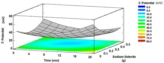 Response surface plot showing significant interaction time (min) versus Na2SeO3 (g) on Z-potential (absolute values).