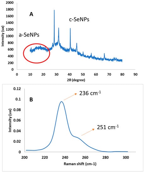 Raman spectroscopy is known to be sensitive to differences in various allotropic modifications and crystallinity of selenium in SeNPs [42] and empirical characteristic frequencies can be used for interpretation of the Raman spectra [43,44]. Figure 2B shows the Raman spectrum of SeNPs obtained under optimal conditions in the lower-frequency region. Two main peaks were observed at 236 and 251 cm−1, characteristic of trigonal [23] and amorphous [45] phases in SeNPs, respectively. Specifically, the band at 251 cm−1 is associated with the A1 stretching Se-Se mode [42], and the peak centered at 236 cm−1 is a characteristic signature of the symmetric stretching mode of t-Se, which can be attributed to the vibration of Se helical chains [46]. Similar results were observed by Zhang et al., who reported trigonal Se (t-Se) and monoclinic Se (m-Se) located at 234 and 254 cm−1, respectively [47]. The obtained results indicate a temporal intermediate of m-Se and t-Se in experimental synthesis conditions, supporting the formation of t-Se nanostructures, as already determined by XRD. Although the amorphous state is unstable and tends to transform into the more stable trigonal form, especially at high temperatures [48], this transformation was not completed under synthesis conditions maintaining m-Se in solution due to the stabilization of active compounds present in CBSE, which contributed to preserving the amorphous region in these SeNPs.