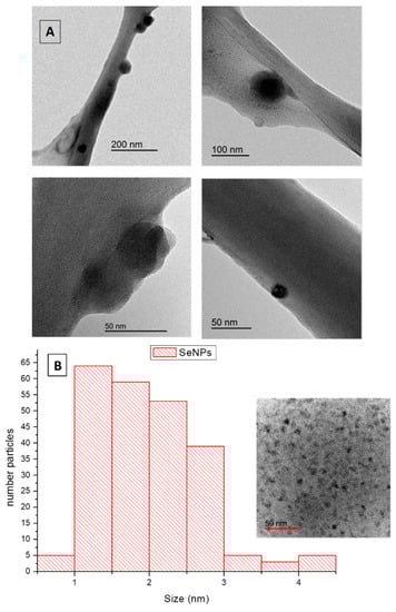 It particularly is relevant to compare our results with those obtained for biologically-synthesized SeNPs since some authors used bacteria to get homogeneous nanoparticles, but all of them obtained diameters higher than 10 nm by some agglomeration through the synthesis process [56,57,58]. To conclude, to the best of our knowledge, no reports have been found with sizes of synthesized SeNPs lower than 10 nm, as found in this work, showing the great potential of CBSE-mediated microwave synthesis to obtain SeNPs with low diameters and no agglomerated structures that could be related to strong reductant and stabilizing agents present in CBSE.