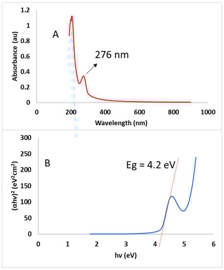 The band gap was obtained by extrapolating the straight portion of the graph (αhυ)2 versus (hυ) on the energy axis at α = 0. Regarding this plot (Figure 4B), the band gap energy was found to be 4.21 eV (R2 = 0.9989) for SeNPs obtained under optimal conditions using microwave assisted synthesis. This band gap energy for green synthesized SeNPs is higher than reported band gaps of 1.65, 1.85 and 2.05 eV for black, monoclinic and amorphous Se, respectively [64], and experimental values reported by other authors which ranged from 2.0 to 3.1 eV [8,23,65]. These differences in band gap energy could be related to the small nanoparticle size obtained in this work, as observed by TEM. Furthermore, when particle size is smaller than the Bohr excitation radius, the band gap will be enlarged due to the quantum confinement effect obtaining a blue shift of the band gap energy for SeNPs compared to its bulk counterpart [66]. So, the bigger the particle size, the smaller the band gap energy reported by other authors, as nanoparticles agglomeration is an important feature in previously reported works and not observed in this study. Therefore, it can be concluded that nanoparticle size has a major influence in the optical absorption spectra of SeNPs, resulting in higher band gaps for small-sized nanoparticles, as observed in our measurements [23,67].