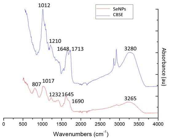 FTIR spectra of CBSE and SeNPs obtained under optimal conditions.