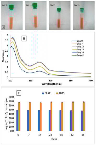 The stability of SeNPs synthesized in the presence of CBSE was evaluated since this is an important factor for the practical application of these nanoparticles in the food industry, particularly in providing nutritional supplements, as well as other possible applications in the medical field [30,35]. The stability of SeNPs obtained under optimal conditions was evaluated by analysing their visual appearance, UV-Vis spectra and antioxidant activity during 55 days under refrigerated conditions at 4 °C. Figure 6A shows the visual aspect of SeNPs after 0, 14, 35 and 55 days. A reddish-yellow colour was observed in these solutions due to the combination of the different nanoparticles obtained with different particle sizes (trigonal and amorphous synthesized Se-NPs), as already reported [66]. No apparent changes in SeNPs dispersions under refrigerated conditions were observed for 55 days, as SeNPs still were homogeneous without showing any precipitation, thus highlighting the excellent stability of these SeNPs synthesized with CBSE.