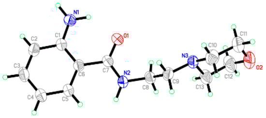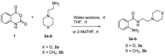 The target products were obtained via two simple and eco-friendly protocols. First, to select the best solvent and conditions for the reaction of isatoic anhydride 1 with two biologically active amine moieties 2a and 2b [,,], 2-morpholinoethan-1-amine 2a was reacted with 1 in different solvents water–acetone [], THF, and 2-MeTHF [,,] in order to compare the yield, purity, and time required to afford the final product 3a (Scheme 1). The three methods worked satisfactorily, but using the 2-MeTHF gave higher yield and purity in somewhat less reaction time, as summarized in Table 1.