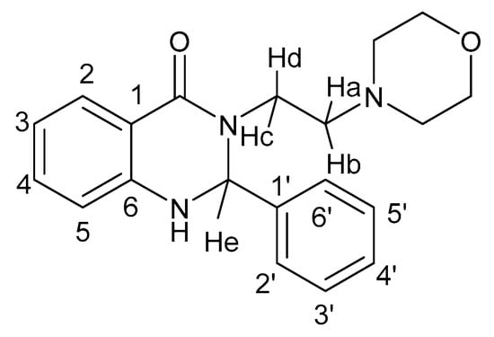 1H-NMR of 4a in CDCl3 as a prototype showed a mutiplet peak at δ 2.40–2.46 related to the four protons of the morpholine residue (CH2NCH2) and the diastereotopic proton Ha, where it has two couplings with Hb and the other two protons Hc and Hd (Figure 4). The multiplet peak observed at δ 2.60 corresponds to the second diastereotopic proton Hb due to the coupling with Ha, Hc and Hd. The same observation was noticed for the other two diastereotopic protons Hc and Hd, where two multiplet peaks were observed at δ 3.04 and 3.93, respectively. The other protons for the morpholine ring showed a triplet peak at δ 3.65 (CH2OCH2). The two singlet peaks at δ 4.50 and 5.90 correspond to He and NH, respectively. The doublet peak at δ 6.52 is related to H5, the triplet at δ 6.85 corresponds to H3, the triplet at δ 7.26 corresponds to H4, the multiplet at δ 7.35–7.38 corresponds to the five protons of the phenyl group, and the doublet peak at δ 7.94 is related to H2. The 13C-NMR spectrum of 4a in CDCl3 showed peaks at δ 41.1 corresponding to –NCH2CH2N–, δ 53.2 related to CH2NCH2 (morpholine ring), δ 55.7 related to the carbon of the ethylene moiety (OC–NCH2CH2N–), δ 65.6 corresponding to CH2OCH2 (morpholine), and δ 57.0 corresponding to NCHN (quinazolinone ring). The aromatic carbon showed peaks at δ 114.7 (C5), 115.7 (C1), 119.0 (C3), 126.6 (C2′,4′,6′), 128.24 (C2), 128.9, 129.2 (C3′,5′), 133.7 (C4), 140.0 (C1′), and 148.4 (C6), while the peak at δ 163.6 corresponds to the carbonyl group (C=O).