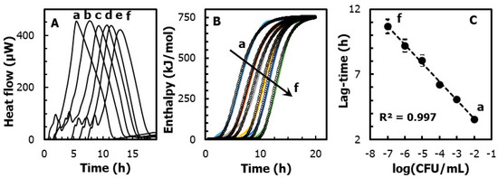 (A) Heat-flow traces of E. coli, at a concentration from (A) 107 to (f) 102 log(CFU/mL). (B) Heat vs. time curves obtained by integrating the area delimited by the heat-flow profile. Shown also as dotted points is the fitting of the experimental data obtained by the Gompertz function. (C) Linear regression of the lag phase, obtained from the Gompertz fitting function, as a function of the E. coli concentration (in CFU/mL).
