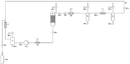 Flowsheet of the supercritical carbon dioxide pilot scale apparatus. CO2: storage tank; E: extraction vessel; S#: separators; H#: heat exchangers; C: condenser; HV#: hand valves; MV: membrane valve; PCO2: diaphragm pump; T: thermocouples; P#: manometers; R: CO2 recirculation; A: liquid storage tank.