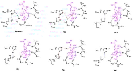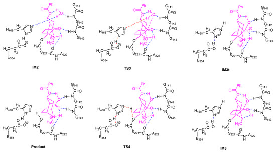 Transition states and intermediates in the acylation stage of hCES1. The ligands are shown in magenta. Non-polar residues which are far from the reaction center are not displayed. Blue dashed lines indicate common hydrogen bonds, and red/magenta dashed lines are bonds to be formed or broken.