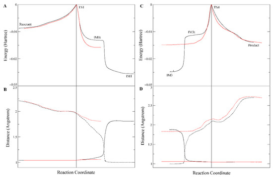 Intrinsic reaction coordinate of TS1 (A,B) and TS4 (C,D). (A,C) Changes of single point energies along the reaction coordinate; (B,D) Distances between cocaine N and NH (solid lines) and between carbonyl O and NH (dash lines). The red lines are the computation results with no polarization function for hydrogens, while the black ones are the normal results.