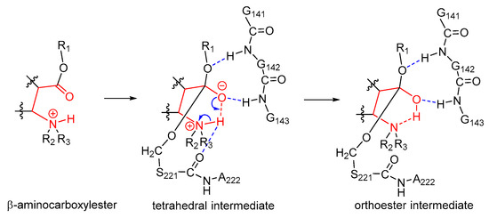 Apparently, the unique chemical structure of the substrate cocaine was required during the formation of orthoester intermediates. Cocaine was actually a β-aminocarboxylester; as shown in Figure 2, upon formation of the tetrahedral intermediate IM1t, the negatively charged carbonyl oxygen atom attracted the hydrogen atom on the β-amino group by a hydrogen bond, and an intramolecular six-membered ring was formed. Such an intramolecular six-membered ring was rather stable and facilitated the proton transfer from the nitrogen atom to the oxygen atom to give the orthoester intermediate IM1. On the other hand, the unique steric/electrostatic restraints imposed by the catalytic cavity of hCES1 were important for keeping the appropriate substrate conformation required for the formation of the intramolecular six-membered ring, and hence were also important for the formation of the orthoester intermediate. Therefore, from this finding, we can further propose that other hCES1 substrates bearing the similar structure features (β-aminocarboxylesters) might also form orthoester intermediates in hCES1 catalytic cavity (Figure 7), and hence their hydrolysis rates might be decreased and their in vivo half-life prolonged. It should be emphasized that, since it is difficult to determine or characterize the detailed conformation of substrate in the covalent enzyme–substrate complex, the existence of orthoester intermediates of cocaine or other similar substrates still needs to be validated in future experimental studies. Nevertheless, we expect that this hypothesis can provide insights or clues for the study of metabolism mechanisms of other hCES1 substrates, as well as the design of drugs which need to be activated or deactivated by hCES1.