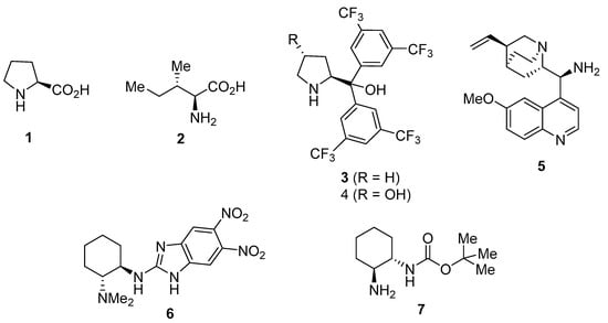 Therefore, the combination of asymmetric organocatalysis and the use of DESs as solvents would show quite powerful and promising in order to achieve the enantioselective preparation of compounds of interest in an environmentally friendly manner. However, the application of DESs in asymmetric organocatalysis is still in its infancy, very few examples being reported (Figure 1). Thus, enantioselective aldol reactions have been performed in DESs using the amino acids L-proline (1) [15,16] and L-isoleucine (2) [17] as organocatalysts, as well as a combination of diaryl prolinols 3 [18] or 4 [19] and an enzyme. In addition, some enantioselective conjugate additions have been performed in DESs, such as the reaction of isobutyraldehyde and β-nitrostyrene and other conjugate addition reactions using 9-amino-9-deoxy-epi-quinine (5) as catalyst [20], the reaction of 1,3-dicarbonyl compounds with β-nitrostyrenes organocatalyzed by 2-amino benzimidazole 6 [21], and the reaction of aldehydes and maleimides organocatalyzed by primary-amine monocarbamate 7 [22]. Moreover, benzimidazole ent-6 has also been used as catalyst for the α-amination of 1,3-dicarbonyl compounds in DESs [23].