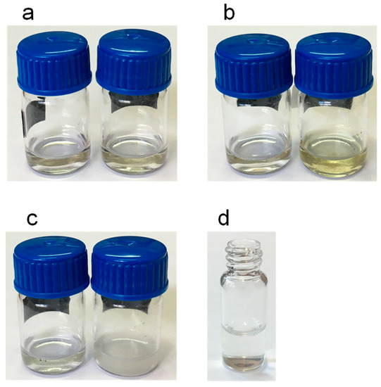 The chromatograms of the extracts obtained with ethyl acetate, isopropanol and chloroform were unsuitable due to the absorption of these solvents at 200 nm. It was concluded that the employment of such solvents would require the evaporation of the extracts followed by their redissolution in methanol or acetonitrile before the chromatographic analysis. In order to simplify the entire analytical process and to prevent possible losses of the volatile analyte limonene, these solvents were not used in further experiments. Examples of the extracts obtained with methanol are shown in Figure 3. As observed, the white copal (Figure 3a) and ocote (Figure 3b) samples were satisfactorily dissolved. However, significant amounts of solid matter were observed when 10–15 mg of the copal in tears resin was treated with 1 mL of methanol (Figure 3c), most probably due to the presence of highly polar gum compounds [8]. For the latter sample, a further study of the solid residue was carried out after centrifugation and separation of the liquid phase. The residue was treated with 1 mL of water, and complete dissolution was observed (Figure 3d), which confirmed the presence of a high percentage of gum in this sample. Therefore, it was concluded that the target compounds were satisfactorily extracted in methanol. As no significant differences between the chromatograms obtained with methanol and acetonitrile were observed, methanol was finally selected.