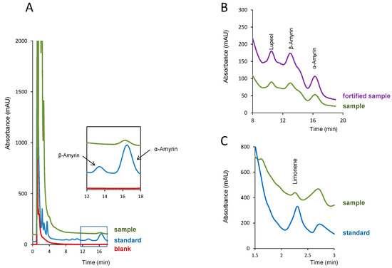 As expected, mobile phases with high contents of acetonitrile (>70%) were necessary for the analytes to be eluted at reasonable run times (<40 min). It must be noted that all the analytes presented decreasing absorbances within the 190–210 nm range and nearly null absorbance at higher wavelengths. Thus, 200 nm was selected as the working wavelength. Under most of the elution conditions assayed suitable separation of the analytes was obtained except for limonene. The isolation of this compound was particularly difficult due to the presence of an intense peak corresponding to the injection solvent (methanol). Because of its high intensity, such peak partially overlapped with that of limonene. The resolution between the two peaks could be improved by using a gradient elution program but at the expense of the total run time. For the rest of the compounds, a good resolution was obtained even with a mobile phase of 100% acetonitrile; with this eluent, the chromatographic run time was <20 min, as shown in Figure 2A. Besides the peaks of the solvent and analytes, two minor peaks were detected at 12.1 min and 15.3 min; those peaks were identified as impurities of β-amyrin. Tetrahydrofuran was also tested as it has an elution strength higher than that of acetonitrile. However, due to its significant absorbance at wavelengths <212 nm, the background noise at the wavelength necessary to detect the analytes was unacceptable. Therefore, this solvent was no longer used.