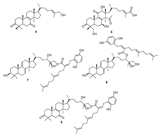 Also triterpenes isolated from the fruiting bodies of Ganoderma leucocontextum and G. lucidum have strong inhibitory properties for diabetes-related enzymes. Ganoderone A (5) and ganoleuconins E (6), M (7), N (8), and P (9) (Figure 3) showed strong inhibitors activity against α-glucosidase from yeast with IC50 values of 12.7, 13.6, 2.5, 5.9, and 13.7 μM, respectively [].