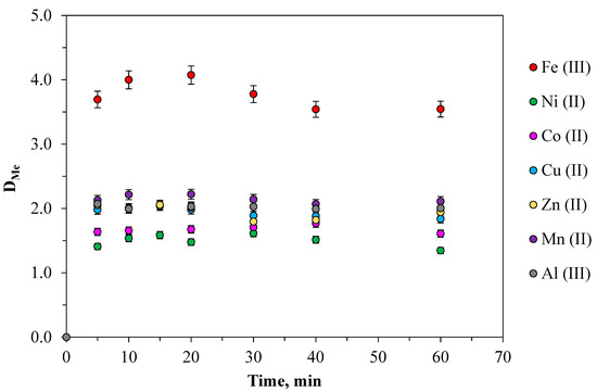 To obtain equilibrium data during extraction, kinetic relationships were established for all the metals studied in the PEO 1500 (16.3 wt%)-NaNO3 (36 wt%)-H2O system as shown in Figure 1. The experiment lasted for 5–60 min at a temperature of 298.15 K, [Me]in = 0.01 mol·L−1. All the metals were extracted into the PEO-phase rather quickly. Equilibrium was reached in the nitrate systems in 5 min, which had to do with the low surface tension of ATPS and, as a result, via a quick mass transfer. Thus, the most favorable mixing time was over 5 min. However, with prolonged contact time, a slight decline could be seen for the distribution ratio, which might be caused by the effect of emulsification in long-time agitation. Increasing the time up to 60 min did not have a substantial impact on extraction recovery.