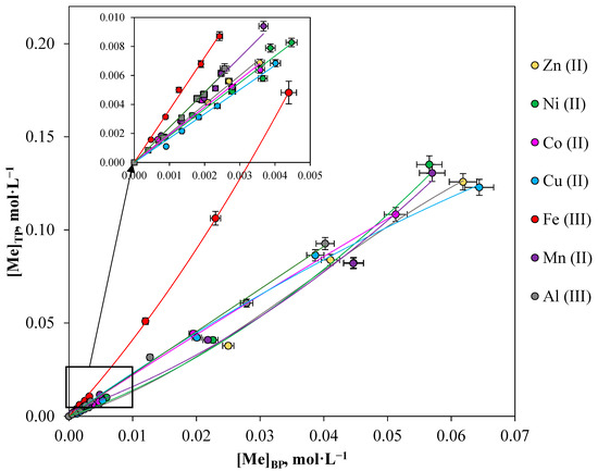 As shown in Figure 2, metals were extracted at close distribution ratio values in a low concentration area. In the region of higher initial metal concentrations (more than 0.01 mol·L−1), the isotherms of metal extraction have an exponentially increasing character, which is characteristic of the mechanism of physical distribution.