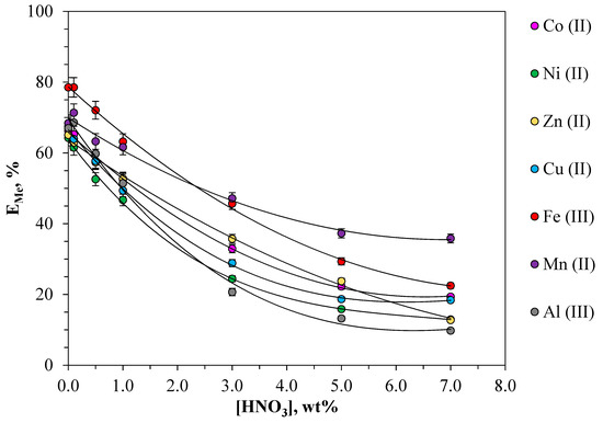 Considering the fact that leaching solutions are mainly solutions with a high concentration of nitric acid (more than 1 mol·L−1), its concentration in the system is an important parameter which can influence both the metal ion form in the solution and the polymer phases degree of hydration. The influence of HNO3 acidity (in the range from 1 to 7 wt%) was studied for the first time on the extraction of a number of the metals studied in the PEO 1500-NaNO3-H2O system (Figure 3).