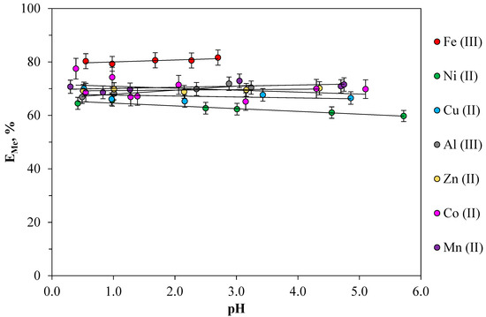 As can be seen from Figure 4, most metals (Co, Ni, Mn, Zn, Cu) are recovered in a wide range of pH values from 0.5 to five. In the studied pH ranges, the efficiency of metal extraction remains practically unchanged. This indicates that proton does not affect the extraction of metals. The studied pH range for each metal is determined by the pH value of the insoluble compounds formation in the heterogeneous system. The obtained dependences make it possible to determine the optimal pH value depending on a specific task. For example, in the case of complex extraction of all the studied metals, a pH range of 0.5 to two was chosen as the optimal pH value of the extraction system.