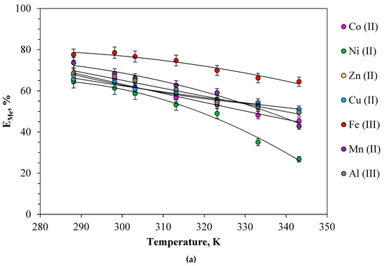 Temperature’s influence was studied on metal extraction in the 288.15–333.15 K range in the PEO 1500-NaNO3-H2O system. Figure 5a shows the effect of temperature on the extraction of metal salts from nitrate solutions. The results show that the temperature slightly affects the extraction efficiency in the range of 288.15–333.15 K, which is consistent with previously obtained data on the extraction of metal salts from chloride and sulfate solutions in systems with polyethylene glycol [36]. As can be seen in Figure 5a, the increase of liquid viscosity at low temperature might be not conducive to mass transfer. At an extraction temperature of 288.15 K, the maximum values of metal salts extraction efficiency were obtained, followed by slowly decrease with a further increase in the extraction temperature. This has to do with the fact that the process is exothermic and an increase in temperature does not favor extraction.