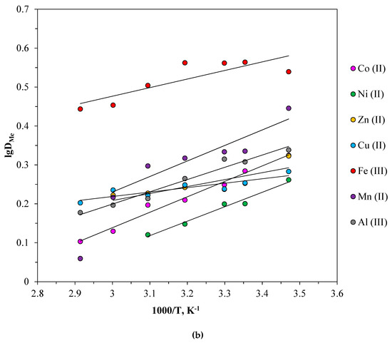 (a) Effect of temperature on the metal extraction; (b) plot of lgDMe vs. 1000/T. Conditions: PEO 1500 (16.3 wt%)-NaNO3 (36.0 wt%)-H2O system, [Me]in = 0.01 mol·L−1.