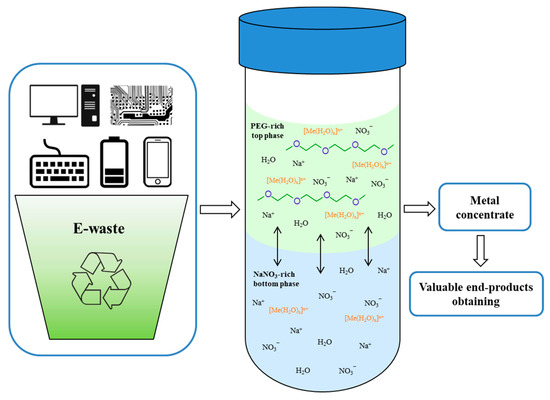 Thus, an alternative technique that can replace traditional liquid–liquid extraction operations has been proposed in this work for the extraction Ni2+, Co2+, Fe3+, Mn2+, Zn2+, Cu2+, and Al3+ ions. The technique employs organic solvent free systems that are based on the principles of green chemistry, with good efficiency and economic viability. The proposed extraction systems can be promising in the development of chemical-technological processes for recycle of electronic waste to achieve the objectives of “a minimization of waste” and “the stable recovery of resources”. However, further work is necessary to improve this technique for industrial applications.