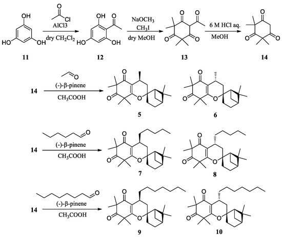 Employing phloroglucinol 11 as the starting material, syncarpic acid 14 was prepared through the synthetic scheme shown in Figure 2. Ficifolidione derivatives were successfully synthesized using 14, β-pinene and a corresponding aldehyde. Since both the target ficifolidione derivative and its C-4 epimer were synthesized at the same time through this synthetic scheme, these compounds were separated using a preparative HPLC system. After HPLC separation, their NMR and high-resolution MS spectra were analysed. We assigned the chemical configuration of the compounds according to the sign of their specific rotation values. The specific rotation values of compounds 5, 7, and 9 were +16, +9, and +17, respectively, to be assigned as the 4-S configuration, whereas those of compounds 6, 8, and 10 were −105, −84, and −87, respectively, to be assigned as the 4-R configuration. This is because the specific rotation values of 4-S-ficifolidione 1 and its propyl derivative 3 were +37 and +17, whereas those of their 4-epimers 2 and 4 were −92 and −26, respectively [8].