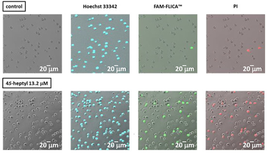 We already reported that DNA fragmentation and caspase 3 activation were induced by ficifolidione in cancer cells [8]. In the present research, we examined whether the modification of the alkyl group influenced apoptosis induction by employing immunofluorescence analysis (Figure 3). The 4-S-n-heptyl derivative 9 was selected as the test compound because the larger flexibility of the n-heptyl group compared with the other alkyl groups might influence the apoptotic potency, and the S configuration of this compound is the same as that of natural ficifolidione. Staining by Hoechst 33342 revealed a blue chromatin condensation pattern in the live and dead HL60 cell nuclei. After treatment with the 4-S-n-heptyl derivative 9 (13.2 μM; twice the IC50 value), the application of propidium iodide (PI) stained some cells as red, indicating dead cells (26% of the cells were stained). On the other hand, activated caspase 3/7 was observed as a green staining in the cells treated with the heptyl ficifolidione derivative (21% of the cells were stained). Since we observed these cells 24 h after application, the percentage of the stained cells was 20–30%, but most of the red-stained cells were also stained green as shown in Figure 3, demonstrating that compound 9 as well as ficifolidione induced activated caspase 3/7, resulting in apoptosis.