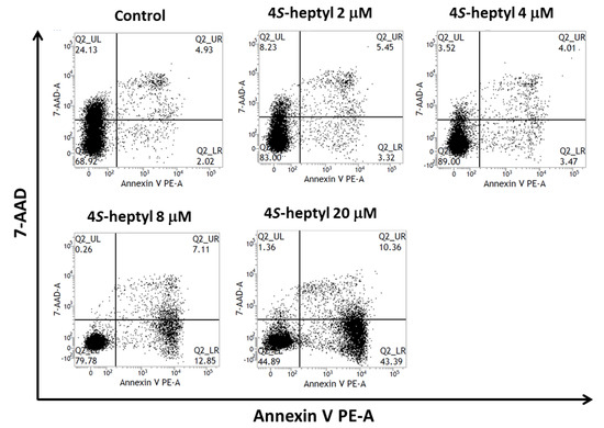 The mechanism of cell death induction was investigated by using flow cytometry (Figure 4). In this experiment, HL60 cells were incubated with 4-S-n-heptyl derivative 9. The percentage of apoptotic cells was determined by double staining with annexin V/7-AAD. The ratio of early apoptotic cells treated with compound 9 was higher than that of the control in a dose-dependent manner (3.32% at 2 μM to 43.39% at 20 μM), suggesting that the n-heptyl derivative 9 induced HL60 cells to early-stage apoptosis.