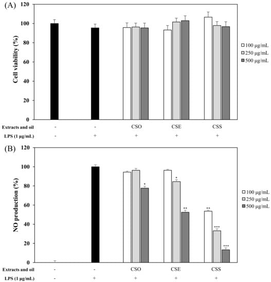 Effects of Citrus junos (C. junos) seed extracts and oil on cell viability (A) and nitric oxide (NO) production (B). RAW 264.7 cells were treated with extracts and oil (100, 250, 500 µg/mL). The samples are C. junos seeds extract (CSE), C. junos seeds oil (CSO), and C. junos seed shells extract without oil (CSS). Cell viability and the amount of nitrite in the culture medium were measured by 3-(4,5-dimethyl-2-thiazolyl)-2,5-diphenyl tetrazolium bromide (MTT) assay and Griess reagents, respectively. Nitrite concentrations of non-treated and lipopolysaccharide (LPS)-treated controls were 0.6 ± 0.1 μM and 16.5 ± 0.2 μM, respectively. The data are expressed as the mean ± SD (n = 3) of three individual experiments, and * p < 0.05, ** p < 0.01, and *** p < 0.001, compared with LPS-treated controls.