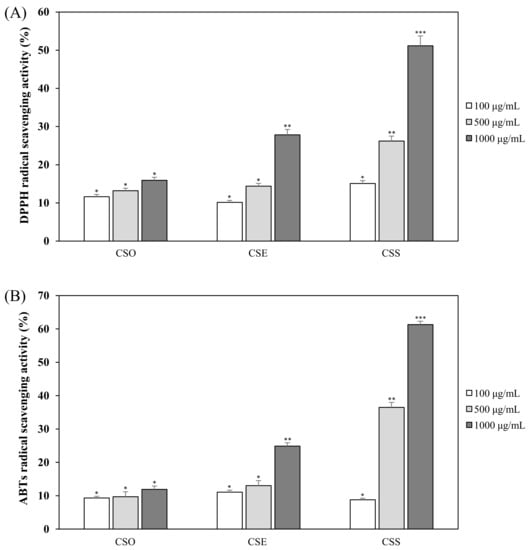 2.2. DPPH and ABTS Radical Scavenging Activities of CSE, CSO, and CSS