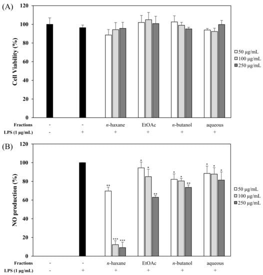 Effects of the CSS fractions on cell viability (A) and NO production (B). RAW 264.7 cells were treated with fractions (50, 100, and 250 µg/mL). Cell viability and the amount of nitrite in the culture medium were measured by MTT assay and Griess reagent, respectively. Nitrite concentrations of non-treated and LPS-treated controls were 0.6 ± 0.1 μM and 16.5 ± 0.2 μM, respectively. The data are expressed as the mean ± SD (n = 3) of three individual experiments, and * p < 0.05, ** p < 0.01, and *** p < 0.001, compared with LPS-treated controls.