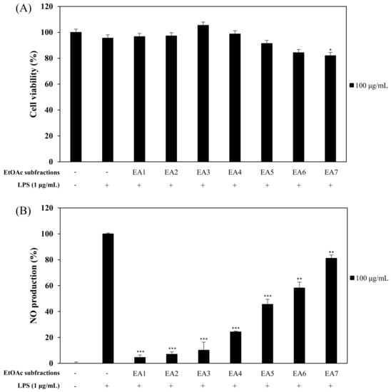 Effects of the ethyl acetate (EtOAc) subfractions (EA1-7) on cell viability (A) and NO production (B). RAW 264.7 cells were treated with EtOAc subfractions (100 µg/mL). Cell viability and the amount of nitrite in the culture medium were measured by MTT assay and Griess reagent, respectively. Nitrite concentrations of non-treated and LPS-treated controls were 0.6 ± 0.1 μM and 16.5 ± 0.2 μM, respectively. The data are expressed as the mean ± SD (n = 3) of three individual experiments, and * p < 0.05, ** p < 0.01, and *** p < 0.001, compared with LPS-treated controls.
