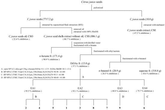 Procedure for isolation of compounds from C. junos seeds using bioactivity-guided fractionation. Nine compounds were isolated from C. junos seeds using bioactivity (inhibitory effects on NO production)-guided fractionation.