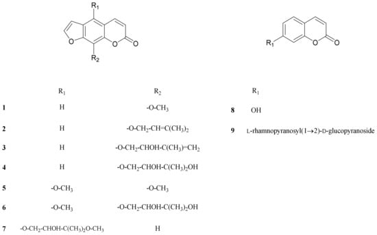 - Kim, B.; Jung, E.; Youn, H.; Hwang, K.; Han, M.; Yu, Y.; Nam, K. Inhibitory Effects of Coumarins from the Fruit of Citrus Aurantium Against iNOS Activity. Yakhak Hoeji 2017, 61, 267–273. [Google Scholar] [CrossRef]