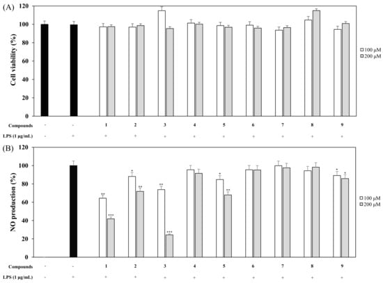 Effects of nine coumarins on cell viability (A) and NO production (B). RAW 264.7 cells were treated with nine coumarins (100 and 200 µM) for 1 h and stimulated with LPS (1 µg/mL) for 16 h. Cell viability and NO production were detected using an MTT assay and Griess reagent, respectively. Nitrite concentrations of non-treated and LPS-treated controls were 0.6 ± 0.1 μM and 16.5 ± 0.2 μM, respectively. The data are expressed as the mean ± SD (n = 3) of three individual experiments, and * p < 0.05, ** p < 0.01, and *** p < 0.001, compared with LPS-treated controls.