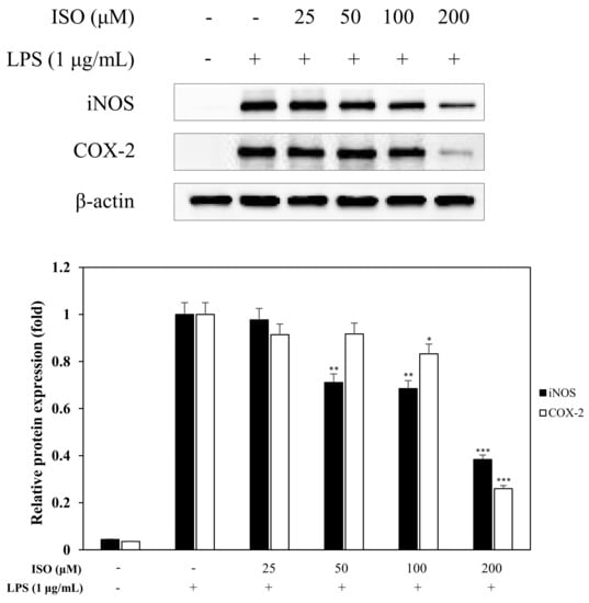 A western blot was performed to measure the effects of ISO on iNOS and COX-2, which cause several diseases including sepsis, inflammation, and strokes [26]. Upon LPS treatment for 16 h, iNOS activation was greatly increased in macrophages (RAW 264.7 cells). However, when macrophages were pretreated with ISO at concentrations of 25–200 μM before stimulation with LPS, there was a significant decrease in iNOS and COX-2 levels (Figure 8).