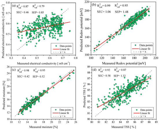 2.2.2. Chemometric Model to Predict Electrical Conductivity, Redox Potential, Moisture, and TSS