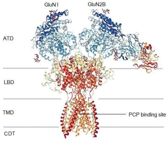 The protein structure of the NMDAR (PDB ID: 5UOW) showing the CDT, TMD, ATD and LBD regions of the GluN1 and GluN2B subunits and the PCP binding site [9].
