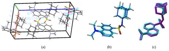 (a) The molecular crystal unit-cell packing of AM-DAN viewed along the [010] plain [19]. Hydrogen-bond interactions are shown in cyan. (b) Overlap of AM-DAN in its crystalline conformation (cyan) and in its MMFF94 energy minima conformation (blue, RMSD = 0.4107 Å). (c) Overlay analysis of the MMFF94 solvated structure (purple) on the MMFF94 gas-phase structure (cyan) (RMSD = 0.016 Å).