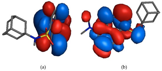 In Figure 4a the HOMO (−8.7265 eV) is localised on the two aryl groups of the dansyl moiety. The LUMO (−0.8856 eV) is located on the sulphonamide moiety and the two aryl groups of the dansyl moiety (Figure 4b). This indicates that the affinity, and potential binding interactions, of the MMFF94 optimised AM-DAN for the PCP binding site of the NMDAR could potentially involve the dansyl moiety and that the adamantane moiety will provide mostly structural bulk, lipophilic function and probable physical blockage of the receptor channel. In addition, the low total energy and large energy gap (7.8409 eV) of HOMO-LUMO suggest that the molecule has good stability and is in its lowest energy conformation.