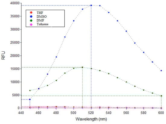 The fluorescent properties of AM-DAN were determined by the methods as described in the experimental section. Figure 5 expresses the effect of each aprotic solvent, varying in polarity, on the emission spectrum of AM-DAN. The emission maximum of AM-DAN (final concentration of 10 µM) in all aprotic solvents was observed between 510–520 nm (Figure 5). There was no significant chemical shift observed between the various aprotic solvents. The intensity, however, varied from solvent to solvent with the polar DMSO solvent yielding the greatest increase in intensity (39191 relative fluorescence units, RFU) while both less polar solvents, THF and toluene, yielded almost-negligible fluorescence (510 RFU and 416 RFU, respectively). This indicates that solvent polarity has profound effects on the emission intensity of AM-DAN. The intensity of the fluorescent signal significantly decreased as the solvent polarity decreased (Figure 5). This preliminary study therefore suggests that AM-DAN displays a solvatochromic effect in different aprotic solvent environments of varying polarities, most likely due to an internal charge-transfer phenomenon.