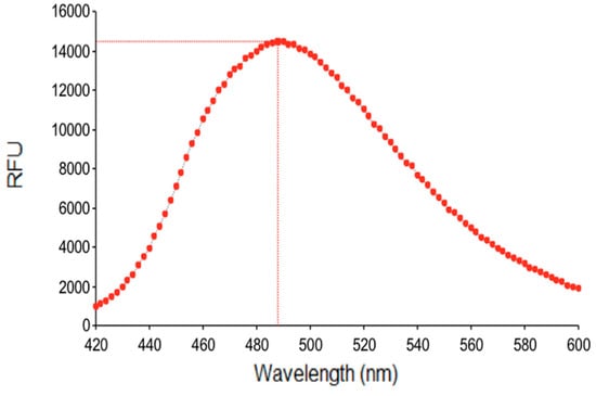 In addition, the fluorescence of AM-DAN was also studied in the DMEM medium used in the NMDAR fluorescent competition binding study. Results indicate that measurable fluorescence (RFU = 14,529) was observed for AM-DAN in DMEM, suggesting that it could be appropriate for use in the development of a drug-PCP fluorescent ligand based binding assay (Figure 6). It should however be noted that in the aqueous DMEM solution a fluorescent shift (emission maximum = 488 nm, shift = ±30 nm) was observed when compared to the aprotic organic DMSO and DMF solvents. This may indicate that AM-DAN interacts with surrounding water molecules within the DMEM solution because of the protic nature of water.