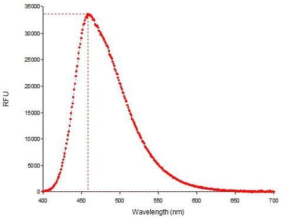 The fluorescence of AM-DAN was also determined in its crystalline solid state (Figure 7). A significant blue shift was observed in its emission spectrum when compared to the emission maximum in solution state (emission maximum = 459 nm, organic solvent shift = ±60 nm, DMEM solvent shift = 29 nm). This observation is most likely due to the intermolecular interactions observed in the crystal field (Figure 3a) having altered the chemical and physical properties of the crystalline AM-DAN. This resulted in changes in the photochemical properties as opposed to that of AM-DAN when dissolved in the various solvents, where these intermolecular bonds were no longer present. The fluorescence data collected, when utilised together, provides valuable information that will be used in the effective design of the fluorescent NMDAR ligand-based assay.
