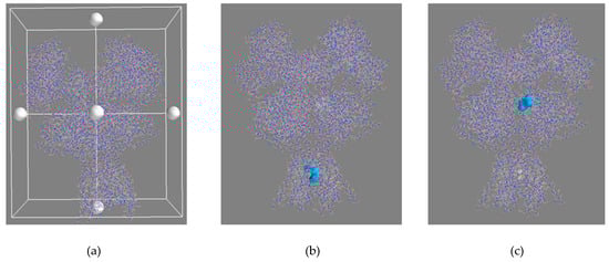 The PyRx virtual screening tool [24] was used to conduct a blind docking experiment to determine the most probable binding site of AM-DAN within the NMDAR (Figure 8). The blind docking of AM-DAN, using the protein structure of 5UOW, was done by placing the docking grid over the entire NMDAR protein without selecting a binding pocket (Figure 8a). Docking results indicate that 8 out of the 10 best ranked poses of AM-DAN were able to bind within the proximity of the NMDAR PCP binding site (Figure 8b, Table 1) [1,9]. Two poses were predicted to bind in the area of the glutamate binding site [1,9], distinct from the PCP-site (Figure 8c). However, their binding energies were not as promising when compared to the top ranked poses of AM-DAN within the PCP binding site (Table 1). This blind docking experiment therefore indicates that AM-DAN should be able to bind to the PCP site of NMDAR. In order to determine the potential binding interactions of AM-DAN within the PCP binding site, further studies were conducted using MOE software [23] where the PCP-site was selected as the binding pocket (see Section 3.4.2).